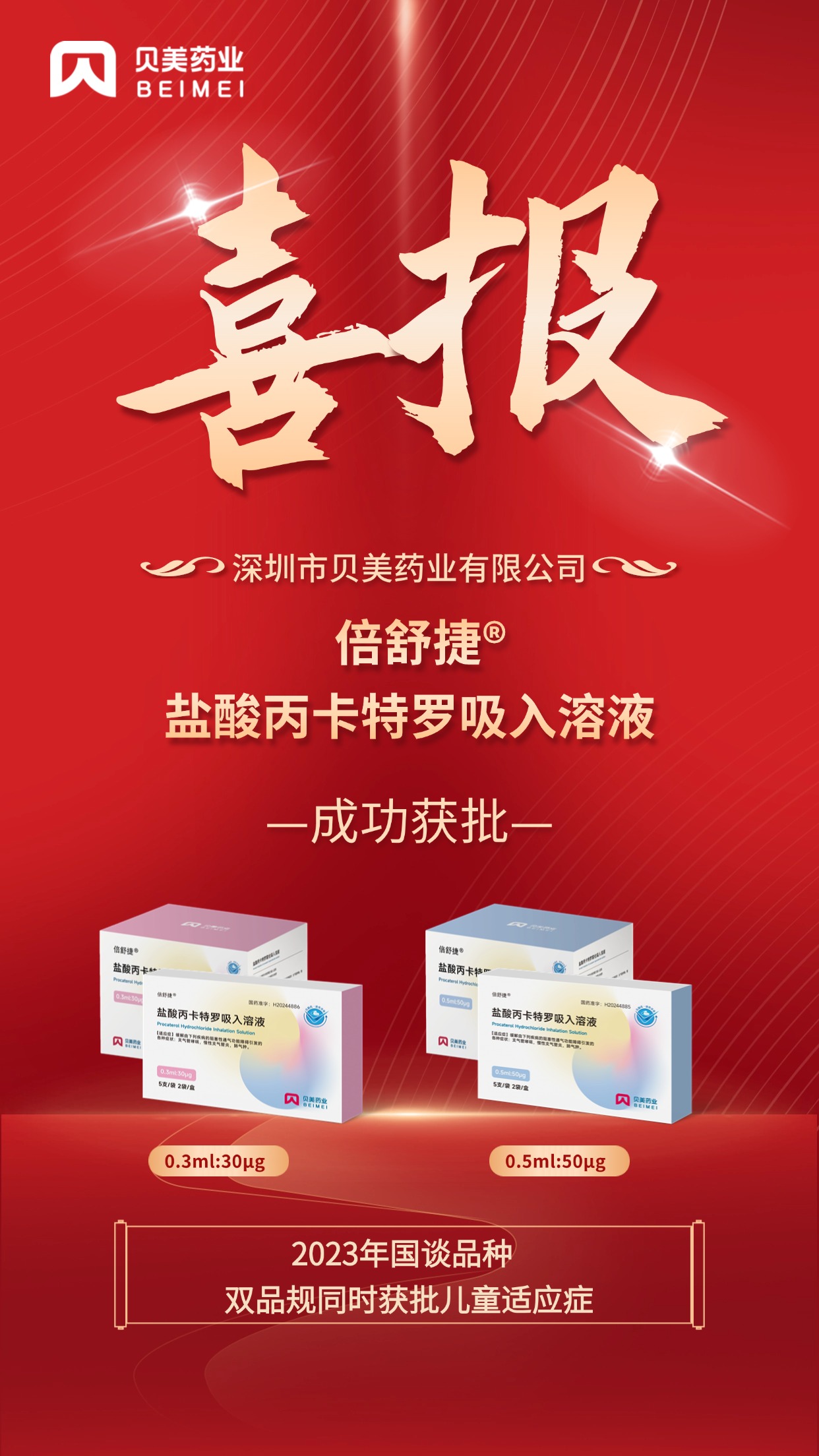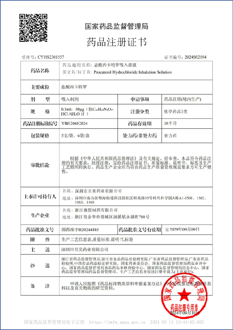 2024年9月14日,深圳市貝美藥業(yè)有限公司申報的鹽酸丙卡特羅吸入溶液(商品名:倍舒捷?)取得國家藥品監(jiān)督管理局(NMPA)頒發(fā)的藥品注冊證書,成功獲批上市 。