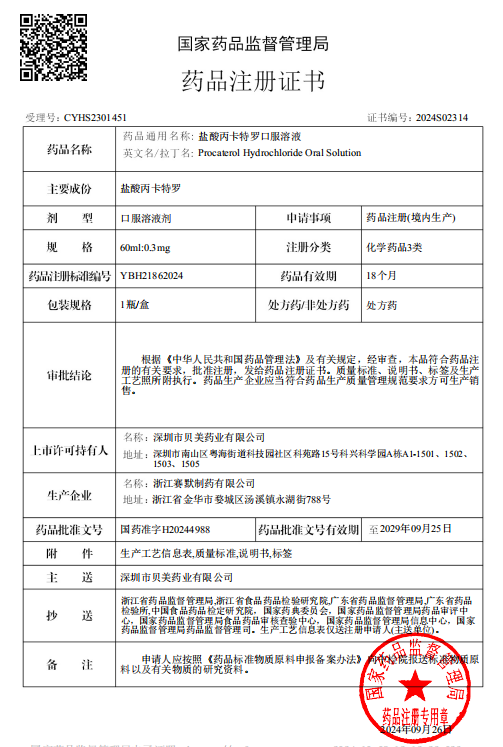 2024年9月26日,深圳市貝美藥業(yè)有限公司申報的鹽酸丙卡特羅口服溶液(商品名:倍舒清?)獲得國家藥品監(jiān)督管理局(NMPA)頒發(fā)的藥品注冊證書,成功獲批上市 。