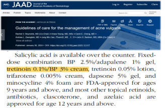 在美國皮膚病學(xué)會(AAD)2024年更新并發(fā)布的《尋常痤瘡管理指南》中,對痤瘡的分類、診斷、評估和治療方案進行了全面的更新,其中TWYNEO?(唯一一款由維A酸0.1%和過氧苯甲酰3%固定劑量組合的外用乳膏)被強烈推薦用于9歲及以上痤瘡患者的治療。