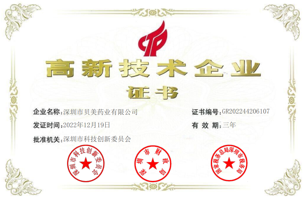 2023新年喜報!近日,全國高新技術(shù)企業(yè)認(rèn)定管理工作領(lǐng)導(dǎo)小組辦公室發(fā)布了深圳市2022年高新技術(shù)企業(yè)認(rèn)定名單,深圳市貝美藥業(yè)有限公司榮獲國家高新技術(shù)企業(yè)證書,正式邁入國家高新技術(shù)企業(yè)行列!