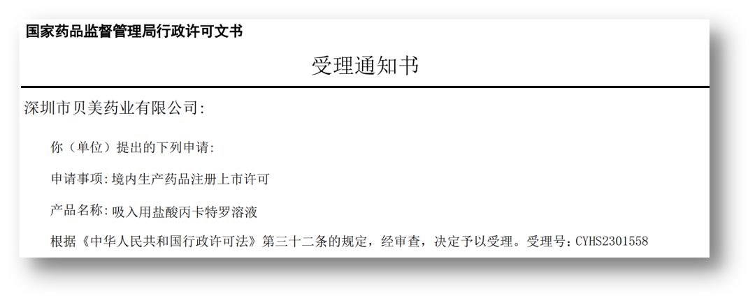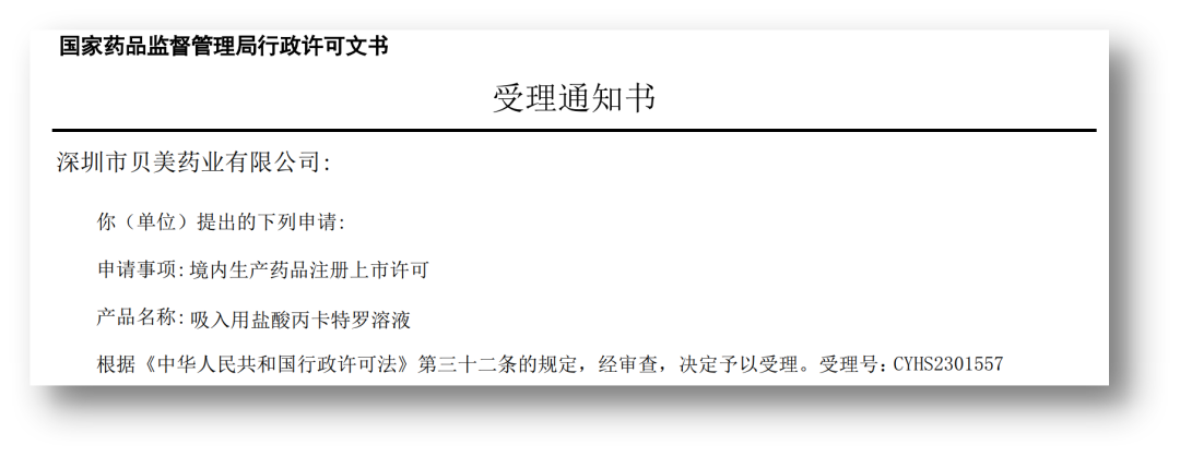 繼2023年5月29日丙卡特羅口服溶液上市申請(qǐng)獲得受理后,本周我司再次迎來好消息。2023年6月6日,深圳市貝美藥業(yè)有限公司(以下簡稱“貝美藥業(yè)”)收到國家藥監(jiān)局下發(fā)的《受理通知書》,貝美藥業(yè)自主研發(fā)的吸入用鹽酸丙卡特羅溶液藥品上市許可申請(qǐng)獲受理。