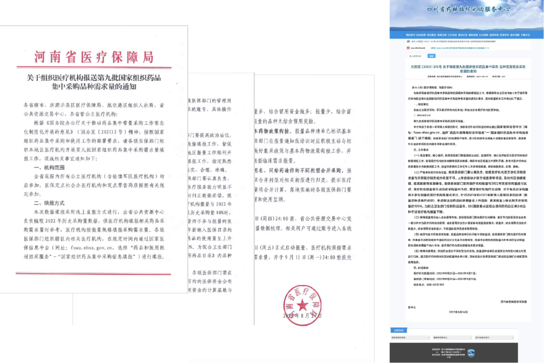 與此同時(shí),河南省醫(yī)保局和四川省藥械招標(biāo)采購(gòu)服務(wù)中心也發(fā)布了填報(bào)集中采購(gòu)數(shù)據(jù)的通知。